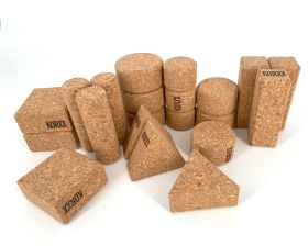 Das Form Starter-Set beinhaltet 21 naturfarbene Korkbauklötze in verschiedenen Formen wie Quadraten, Kreisen, Dreiecken, Säulen und Rechtecken, die für vielfältige Baukreationen genutzt werden können und aufgrund ihrer abgeschrägten Kanten und geschliffenen Oberflächen bereits von Kindern ab dem 2. Lebensjahr genutzt werden können.
